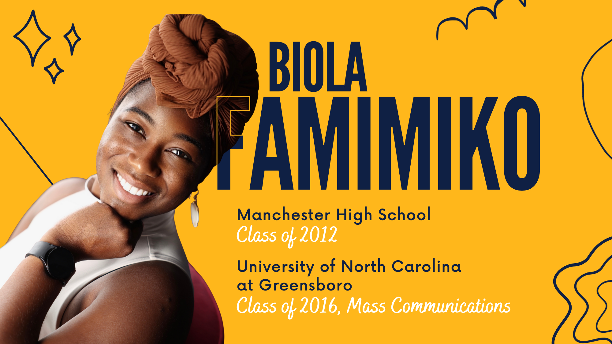 Biola Famimiko. Manchester High school, Class of 2012. Campbell University, 2012-13. Graduated from University of North Carolina at Greensboro (UNCG), Class 2016, Mass Communications.